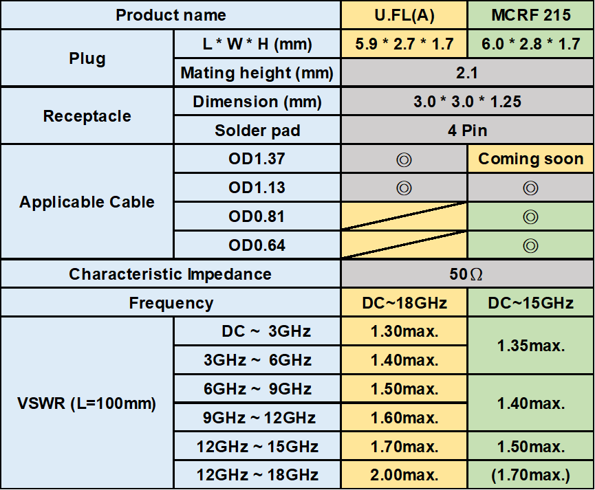 •215コネクタがリセ及びプラグ二種類があり、HRS社のU.FL(A)機種の同級製品であること。